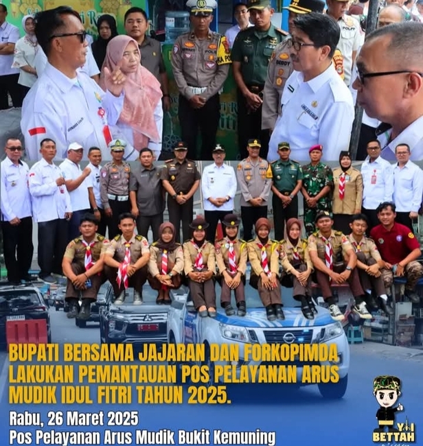 Bukit Kemuning (GN)– Bupati Lampung Utara, Dr. Ir. H. Hamartoni Ahadis, M.Si., bersama jajaran Pemerintah Kabupaten Lampung Utara dan unsur Forum Koordinasi Pimpinan Daerah (Forkopimda) melakukan pemantauan langsung terhadap Pos Pelayanan Arus Mudik Idul Fitri 2025 di Kecamatan Bukit Kemuning, Rabu (26/3).