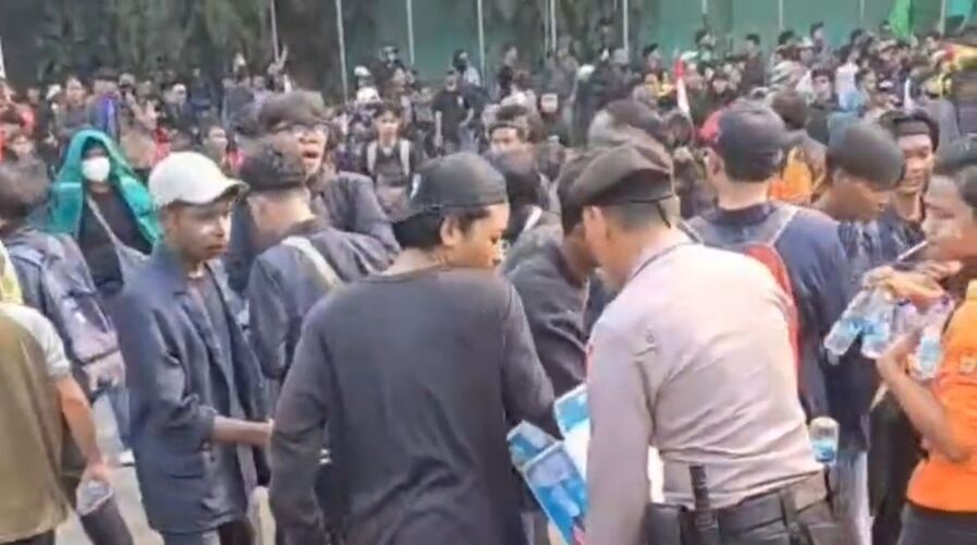 Beberapa petugas terlihat mendekati kerumunan dan membawa dus berisi air mineral dan membagikannya kepada massa aksi yang antusias menerimanya.