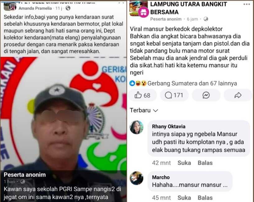 Atas kejadian itu, sampai viral di grup Facebook Lampura Bangkit. Diduga oknum debt Collector yang bernama Mansur, juga diduga terlibat dalam gerombolan yang sempat melakukan dugaan pemerasan pada warga Lampung Tengah itu.