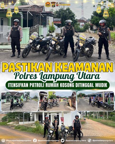 Lampung Utara(GN) – Rumah yang ditinggal mudik rawan menjadi sasaran pencurian. Untuk mengantisipasi kejahatan selama momen Lebaran, personel jajaran Polres Lampung Utara meningkatkan patroli ke rumah-rumah kosong.