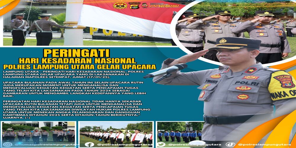 Peringatan Hari kesadaran nasional tidak hanya sekadar upacara rutin bulanan tetapi juga untuk menganalisa dan mengevaluasi kegiatan-kegiatan serta pencapaian tugas yang telah kita laksanakan diwilayah hukum polres lampung utara untuk menekan angka pelanggaran dan gangguan kamtibmas ditahun 2025 serta ditahun-tahun berikutnya,” Ujarnya. (*)