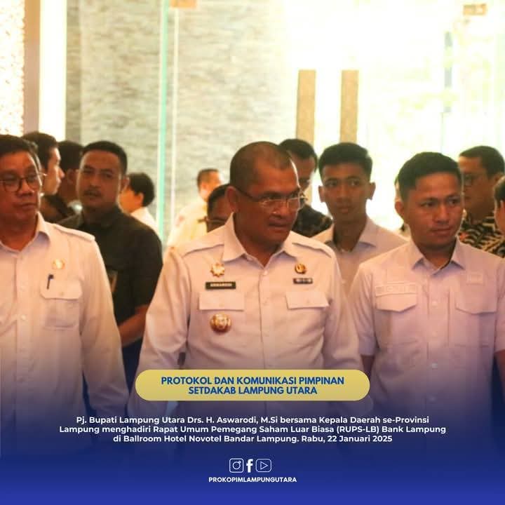 BANDAR LAMPUNG (GN)– Penjabat Bupati Lampung Utara, Drs. H. Aswarodi, M.Si., bersama para Kepala Daerah se-Provinsi Lampung menghadiri Rapat Umum Pemegang Saham Luar Biasa (RUPS-LB) PT. Bank Lampung yang berlangsung di Ballroom Hotel Novotel, Bandar Lampung, Rabu (22/01/2025).