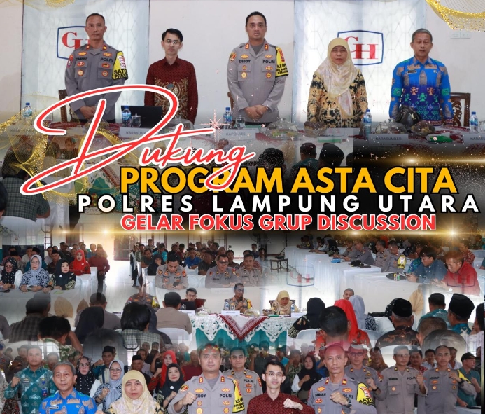 FGD dengan tema ” Peran Polri Dalam Mendukung Program Pemerintah Asta Cita Tahun 2024 di Kabupaten Lampung Utara” tersebut di hadiri oleh Kapolres Lampung Utara AKBP Deddy Kurniawan, Pejabat Utama Polres Lampung Utara, Mitra Kamtibmas dan elemen masyarakat.