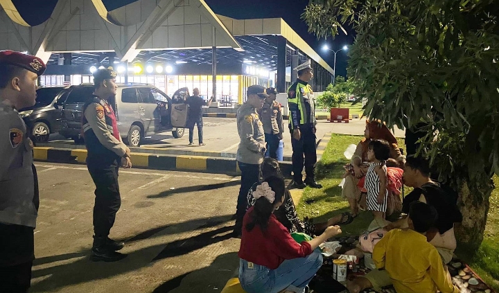 Kepala Pos Pelayanan (Ka Pos Yan) Rest Area 208A Tol Terpeka, Ipda Sigit Kartono,bersama dengan beberapa personel Operasi Lilin Krakatau 2024,menyampaikan langsung imbauan kepada pemudik Nataru.Pada hari Kamis (02/01/2025), pukul 20.30 WIB s/d selesai, di Rest Area 208A Tol Terpeka, Kampung Warga Indah Jaya, Kecamatan Banjar Agung, Kabupaten Tulang Bawang.