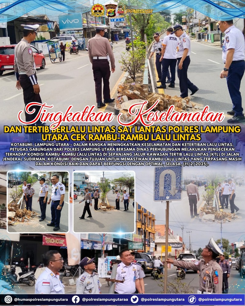 Kotabumi, Lampung Utara (GN)– Dalam rangka meningkatkan keselamatan dan ketertiban lalu lintas, petugas gabungan dari Polres Lampung Utara bersama Dinas Perhubungan melakukan pengecekan kondisi rambu-rambu lalu lintas di sepanjang jalur Kawasan Tertib Lalu Lintas (KTL) di Jalan Jenderal Sudirman, Kotabumi.